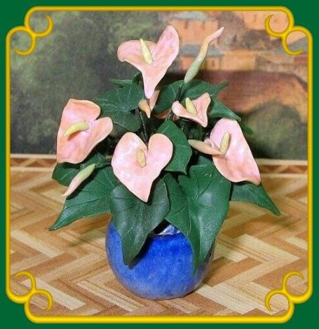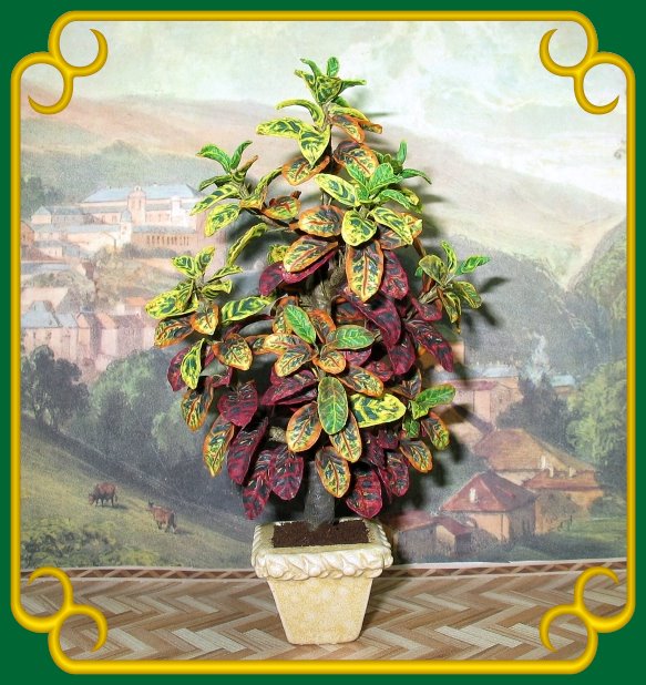 Hallo Minifreunde! Auf dieser Seite möchte ich Euch Pflanzen vorstellen, die Beatrix Bernardi in Handarbeit für mein Puppenhaus gefertigt hat. Bea ist eine private Hobby-Miniaturistin und lebt in der Nähe von Frankfurt/Main. Sie ist von Beruf Floristin. 2002 besuchte Bea das Puppenmuseum in Hanau und sah das Kaufhaus von Mini Mundus. Sie war so begeistert, dass sie nun selber mit der Herstellung von Miniaturen im Maßstab 1 : 12 begann. Zu Anfang stellte sie Blätter und Blüten für Blumensträuße her, etwas später dann die erste Grünpflanze. Schon 2003 zeigte sie ihre Arbeiten erstmals als private Ausstellerin auf der Miniaturmesse in Soest. Im Laufe der Jahre hat Bea viele schöne Pflanzen für mein Puppenhaus gefertigt. Die Pflanzen sind aus Fimo. Alle Blätter sind beweglich und auch Staub ist kein Problem. Die Pflanzen können schon mal eine Dusche vertragen. Lange hat Bea nach der richtigen Technik gesucht, damit sie auch mehrfarbige Blätter und interessante Blattmuster so genau wie möglich herstellen kann. Die Bilder zeigen, wie gut ihr das gelungen ist. On this page you can see plants which Beatrix Bernardi manufactured for my dollhouse. Bea is a private hobbyist for miniatues on a scale 1:12. She lives near Frankfurt / West Germany. She is a professional florist. In the year 2002 Bea visited the Dolls Museum in Hanau and saw the Mini Mundus department store. She was so excited that she began her own production of miniatures on a scale of 1:12. At the beginning she made leaves and flowers for bouquets, a little later then her first foliage plant. In early 2003 she showed her miniatures as a private person on the miniature trade show in Soest / Germany. Over the years Bea produced many beautiful plants for my dollhouse. The plants are made of Fimo. All the leaves are flexible and even dust is not a problem. The plants can tolerate a shower. A long time Bea has searched for the right technology to produce multicolored leaves and interesting leaf patterns as closely as possible. Look at the pictures, she did succeed very well